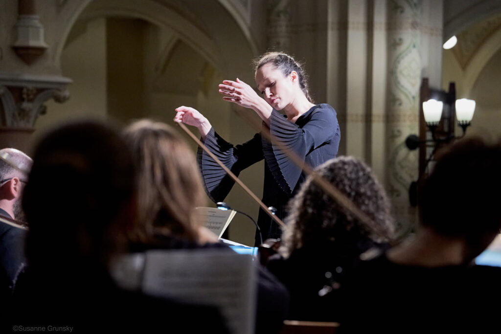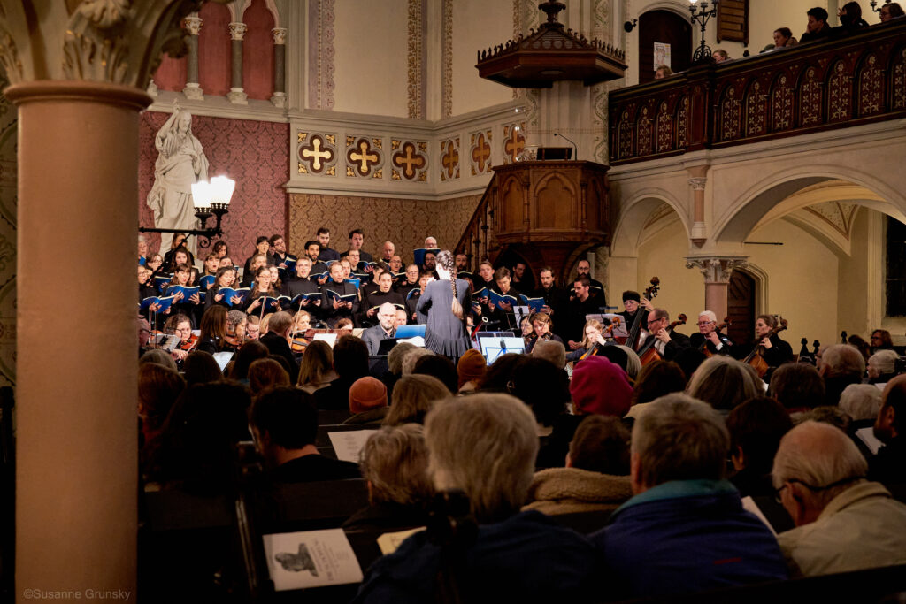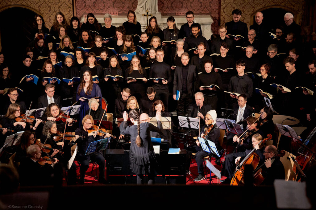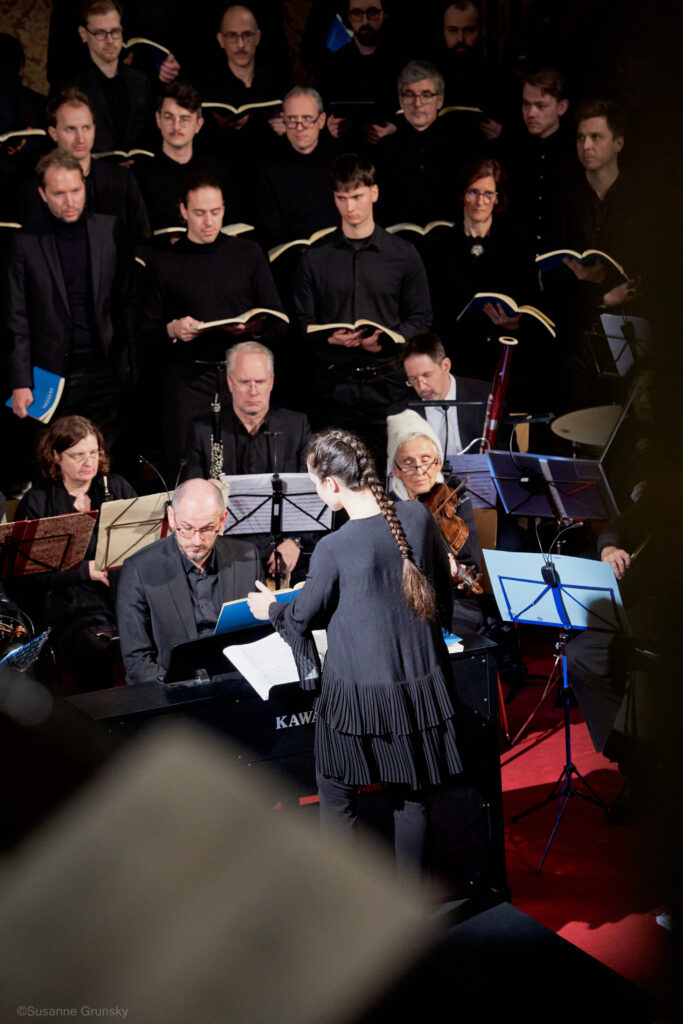 Die Proben mit Orchester waren für viele von uns in der Tat eine große Herausforderung. Wir Chorlis staunen wieder einmal aufs Neue über Katjas Ausdauer und Hingabe – und über ihre dirigentische Vielfalt und Wendigkeit. Während der Proben stehen viel und singen wenig – so ist das, wenn man als Chor eben nur eine Stimme im musikalischen Gesamtgefüge bildet. Unsere Generalprobe – etwas über fünf Stunden intensive Probenarbeit, für viele von uns die bereits beim Aufbau mitangepackt haben, noch deutlich länger – endet kurz nach 23:00 Uhr. Katja macht das Beste aus dem wenigen Platz, der für Chor, Orchester und Solist:innen zur Verfügung steht. In Katjas Blick spiegelt sich jeder falsche Ton, welchem Instrument oder Stimmgruppe er auch entkommen mag. Sie bleibt dennoch stets ruhig und beharrlich, probt kritische Stellen und Übergänge mehrfach – und es wirkt, wie wir meinen.